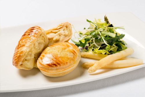 U kunt een plakje kaas, bijvoorbeeld cheddar, toevoegen. Maak het bladerdeeg deksel van de pie aan één kant open, schuif vervolgens de kaas er tussen en dan de oven in. Voilá, zo simpel, en eens iets anders op tafel!